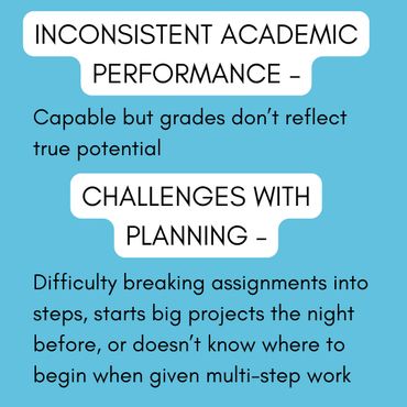 3. Academic coaching sessions: These 60-minute sessions are held on a weekly basis, and they are individualized for each student. We will work on strengthening executive function skills to help break the cycle of overwhelm, procrastination, and disorganization. In-person sessions are held in High Point with Zoom sessions available as needed.