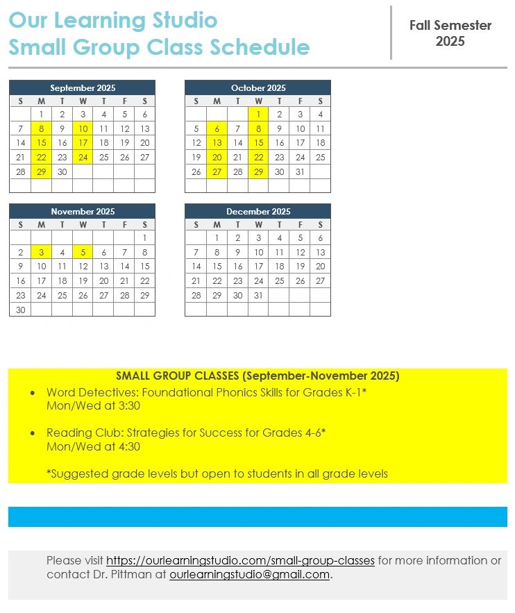 Small group classes are offered just 2-3 times a year, and they are limited to just 10 students. Tuition for small group classes is a 50% savings compared to the tuition for one-on-one tutoring, and Dr. Pittman is an approved ESA+ provider for students participating in this program.